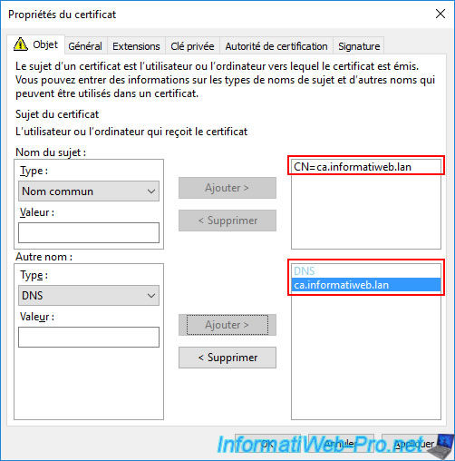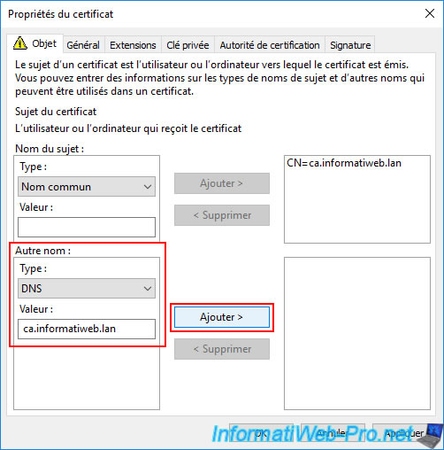 Pour cela, sélectionnez "Nom commun" pour le type de sujet et indiquez le nom de domaine souhaité (dans notre cas : ca.informatiweb.lan) comme valeur.