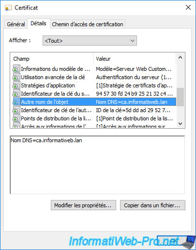 Dans l'onglet "Détails", si vous sélectionnez le champ "Objet", vous verrez que le nom commun (CN) correspond au nom de domaine du serveur où est installée l'interface web de votre autorité de certification.