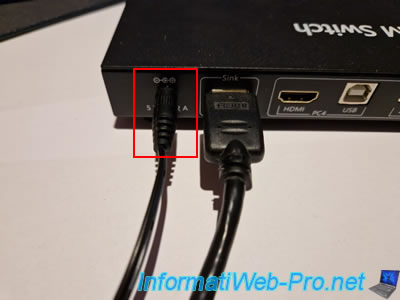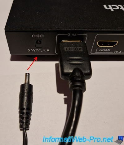 Pour alimenter électriquement ce KVM, vous devrez brancher le petit connecteur rond du transformateur dans le port "5 V/DV, 2 A" situé à l'arrière du KVM.