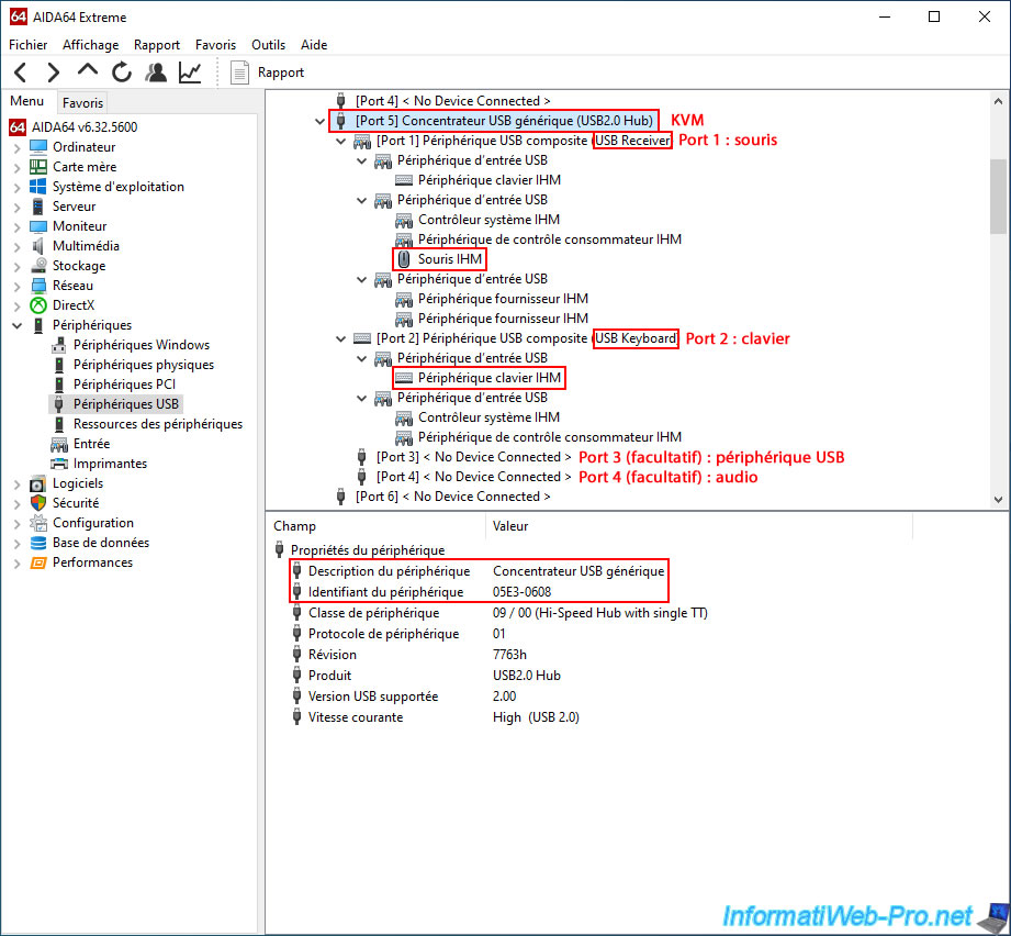 Comme vous pouvez le voir sur l'image ci-dessous, notre KVM est connecté sur le port 5 de notre ordinateur et est reconnu comme un simple Hub USB 2.0.