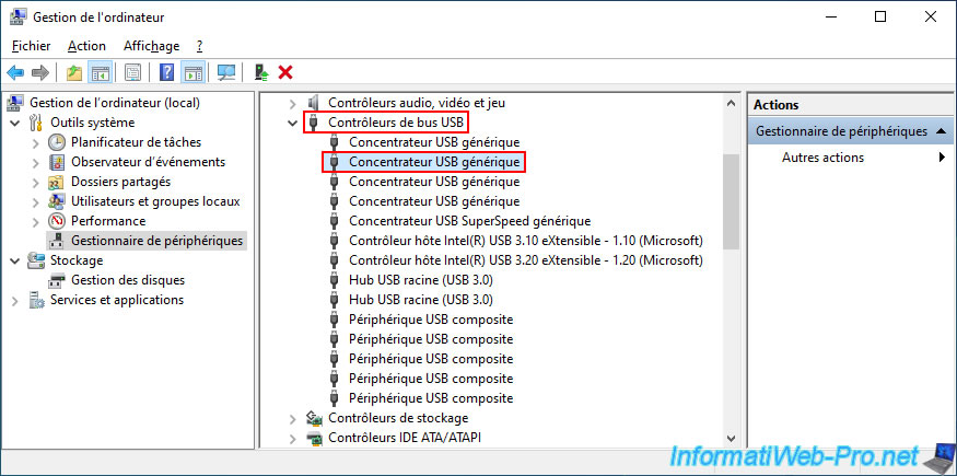 Sous Windows, le "Concentrateur USB générique" se trouve dans la section "Contrôleurs de bus USB" du gestionnaire de périphériques.