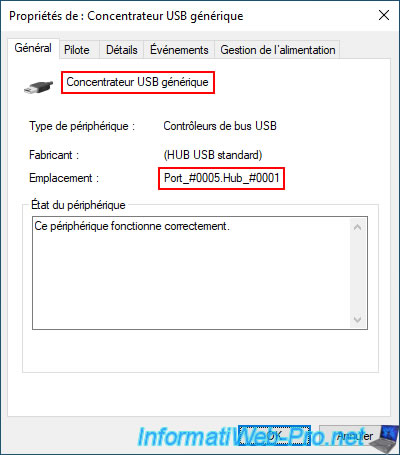Si vous sélectionnez le port "[Port X] Concentrateur USB générique (USB2.0 Hub)", vous pourrez voir l'identifiant du périphérique : 05E3-0608.