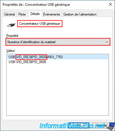 Une fois que vous avez trouvé le bon "Concentrateur USB générique", allez dans l'onglet "Détails", sélectionnez "Numéros d'identification du matériel" et vous retrouverez le même identifiant matériel "VID_05E3&PID_0608".