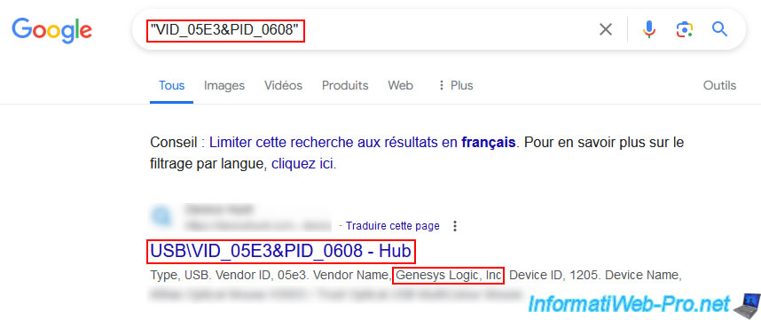 Si vous cherchez cet identifiant matériel "VID_05E3&PID_0608" sur Google, vous trouverez facilement des sites vous indiquant que le fabricant est "Genesys Logic, Inc".