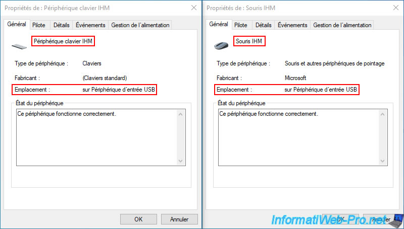 Si vous faites un double clic sur ces périphériques, vous verrez qu'ils sont simplement branchés sur un périphérique d'entrée USB.