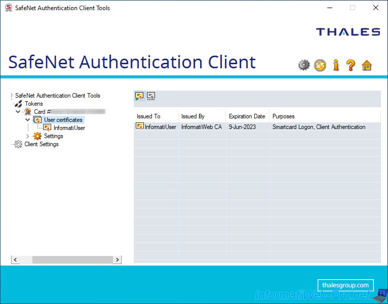 Le certificat importé apparait dans la section "User certificates" de SafeNet Authentication Client (SAC).