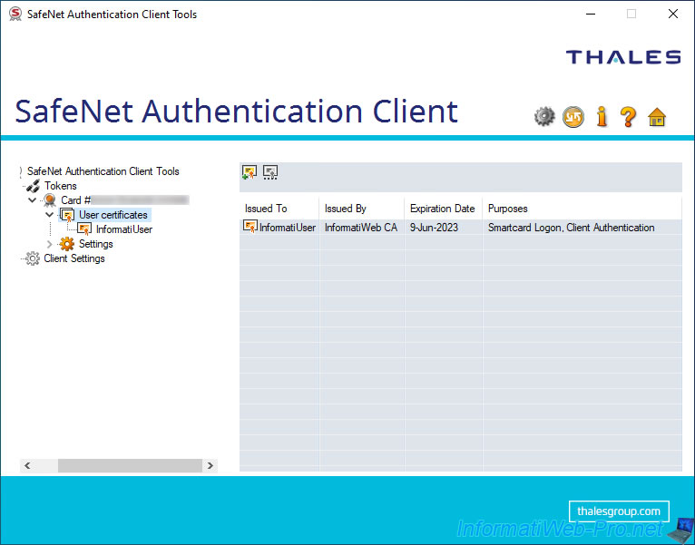 Si vous cliquez sur l'icône "i" (en haut à droite), vous pourrez voir le nom et la version de SafeNet Authentication Client, ainsi que l'adresse du site officiel de Thales (anciennement Gemalto).