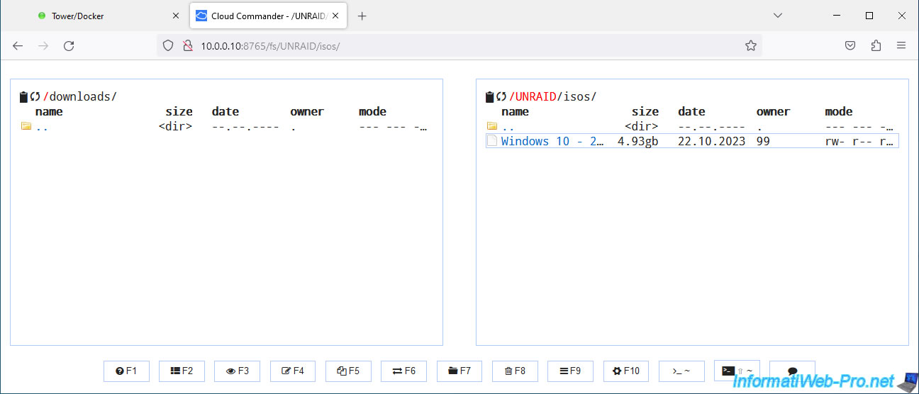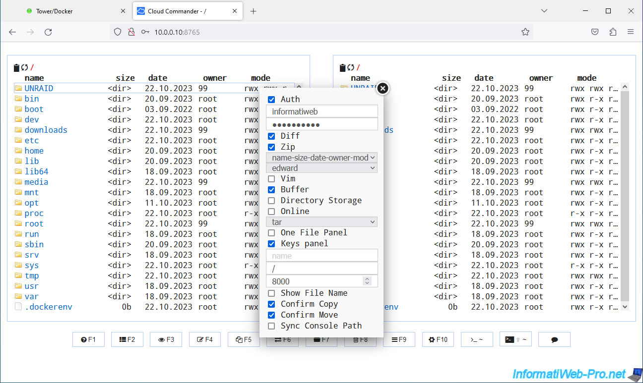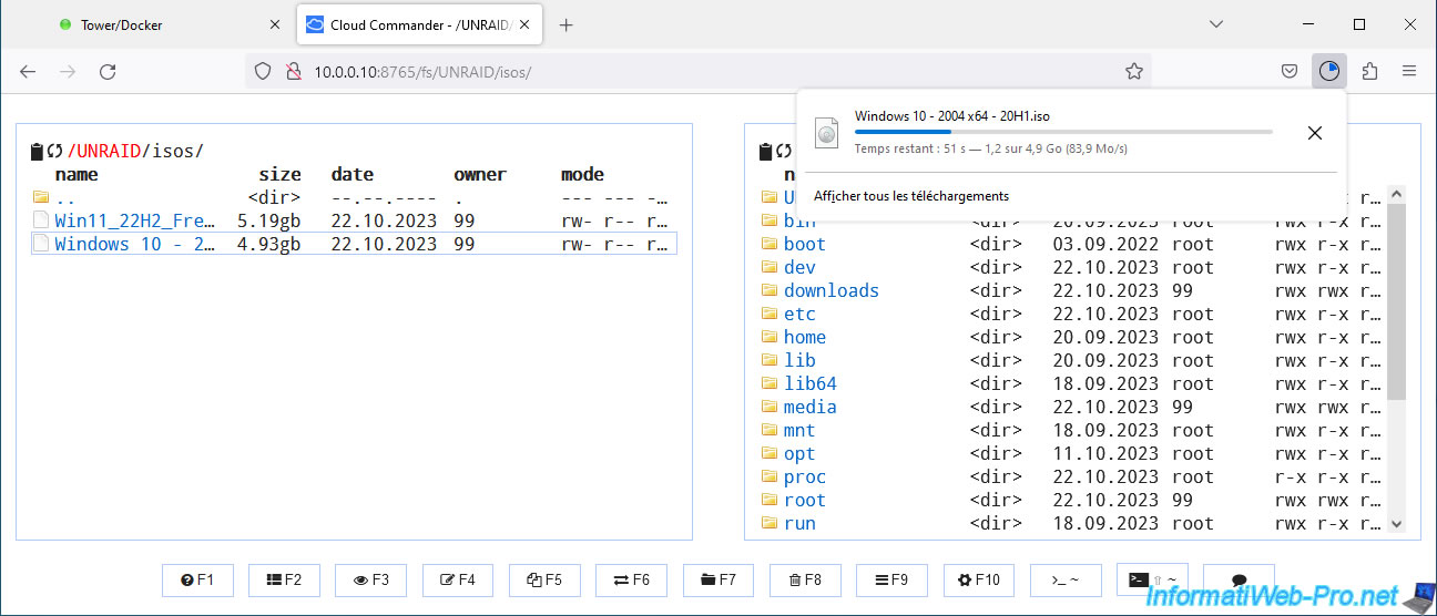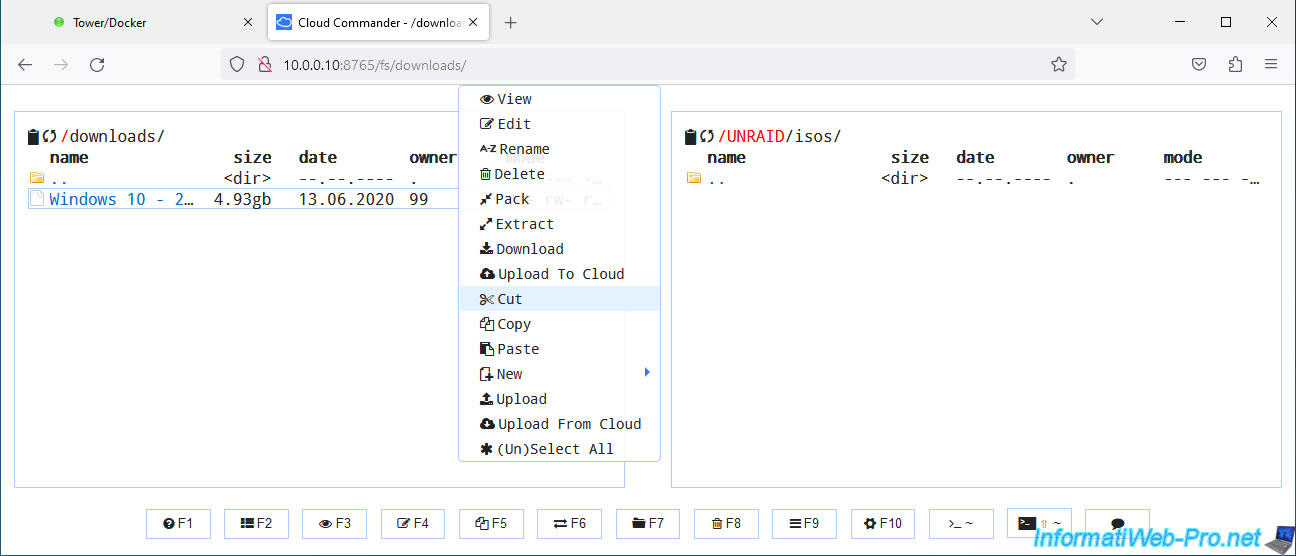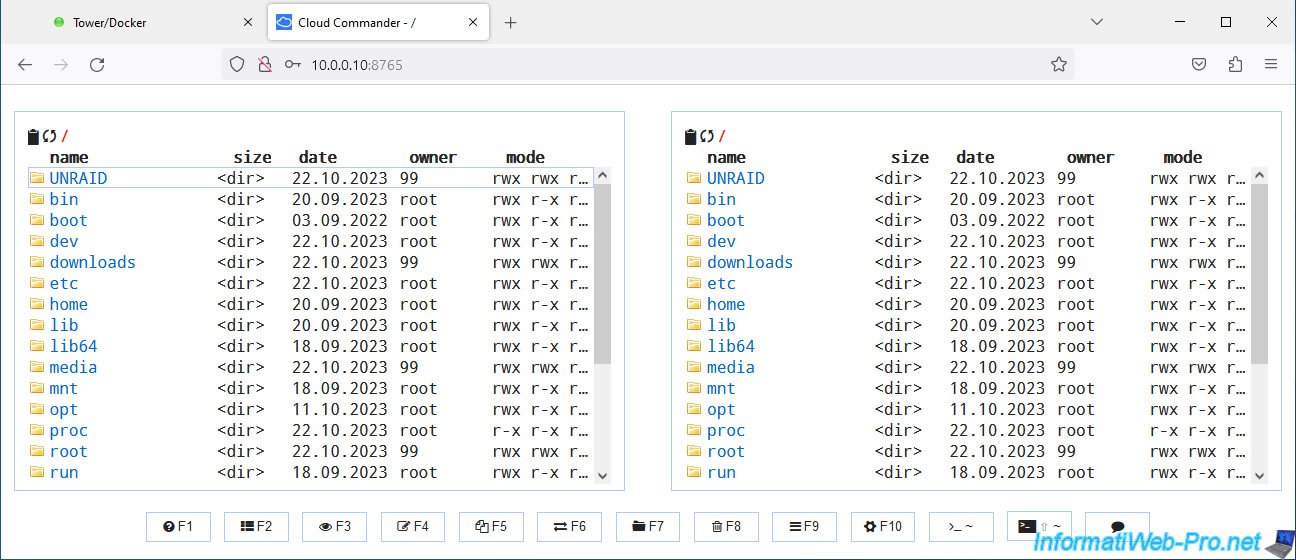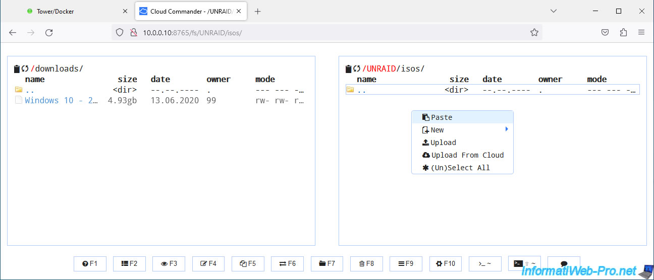 Pour déplacer un fichier ou un dossier sur votre serveur Unraid grâce à Cloud Commander, placez-vous dans le dossier source à gauche et dans le dossier de destination à droite.