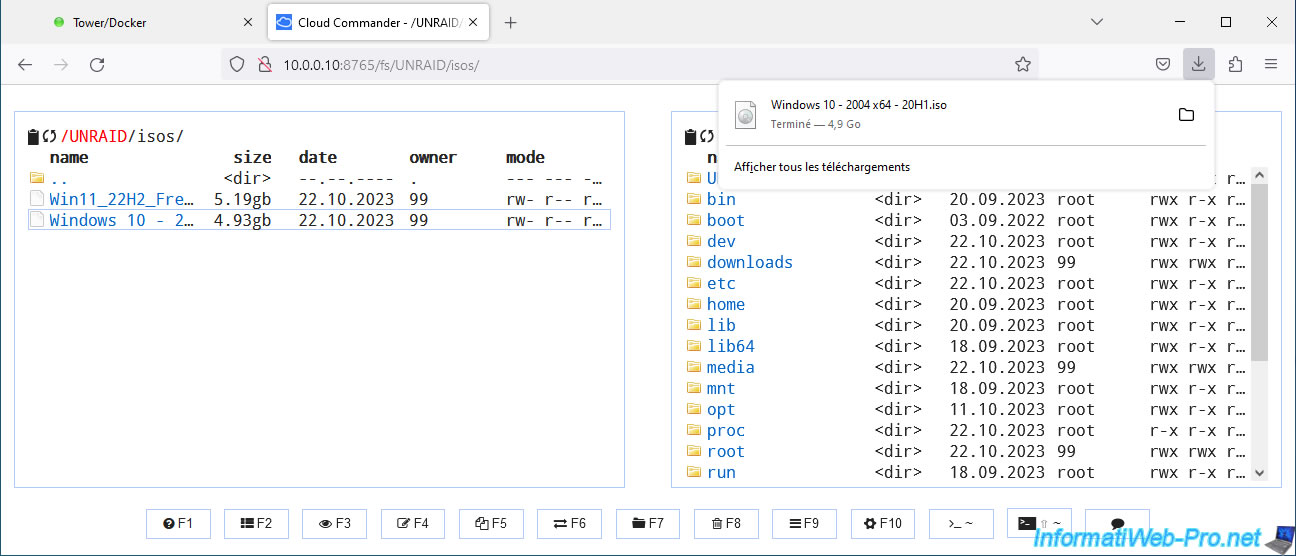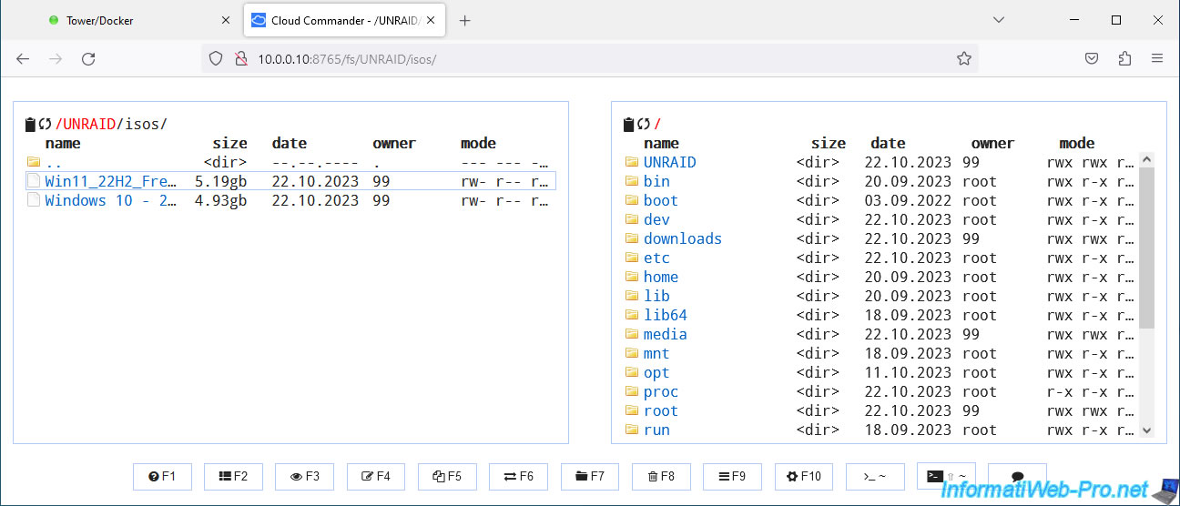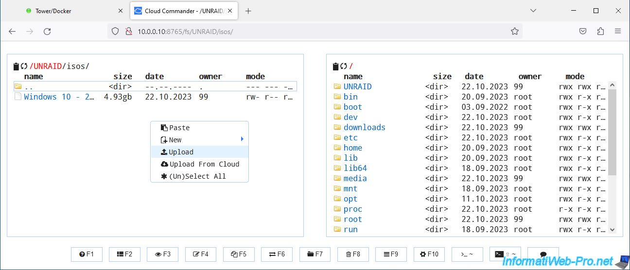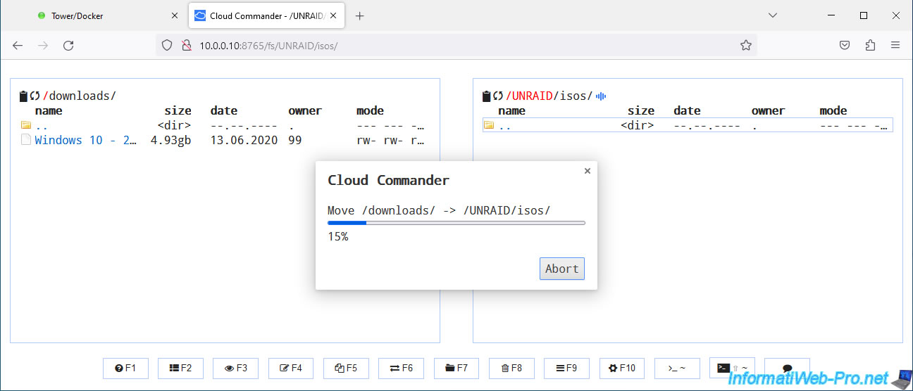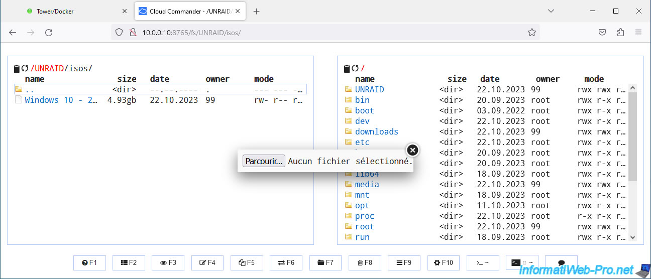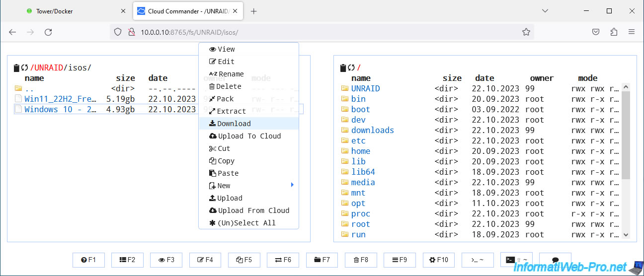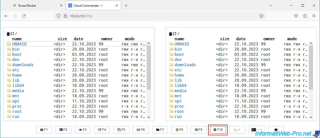 Pour déplacer un fichier ou un dossier sur votre serveur Unraid grâce à Cloud Commander, placez-vous dans le dossier source à gauche et dans le dossier de destination à droite.