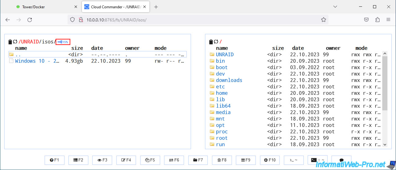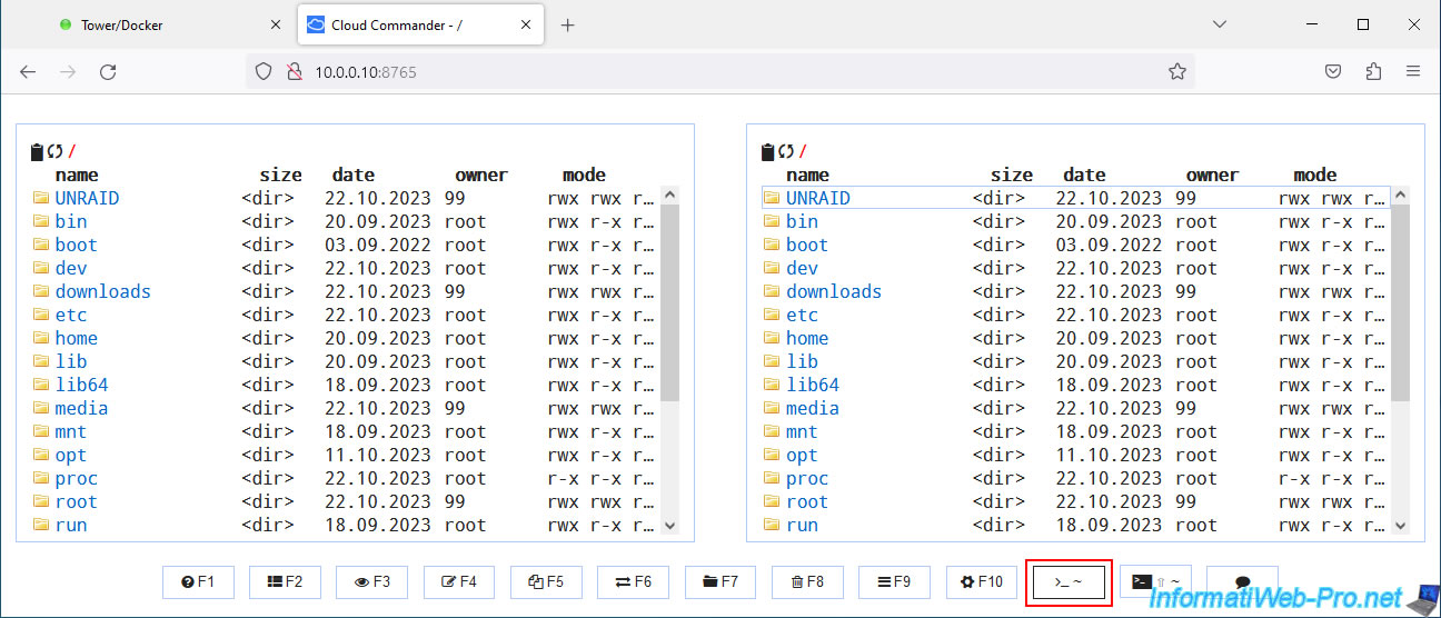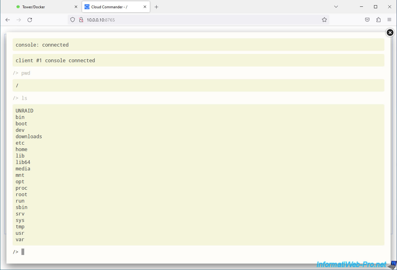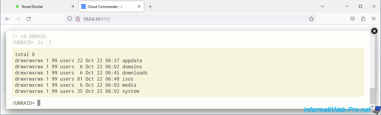 Notez que le système de fichiers disponible en ligne de commandes est celui visible par Cloud Commander et non par le serveur Unraid.