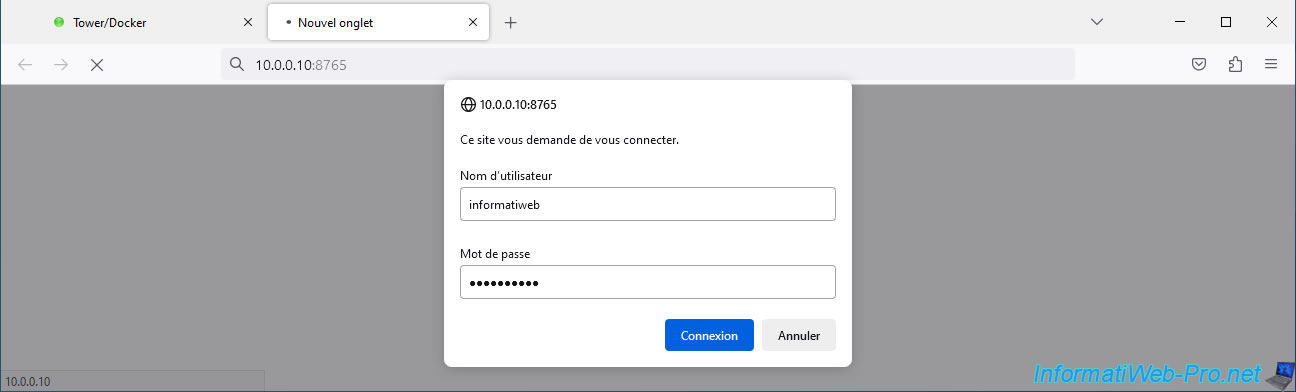 Dans notre cas, nous avions indiqué "informatiweb" en nom d'utilisateur et un mot de passe.