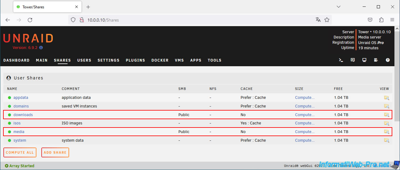 Pour ce tutoriel, nous avons créé 2 partages publics : downloads et media.