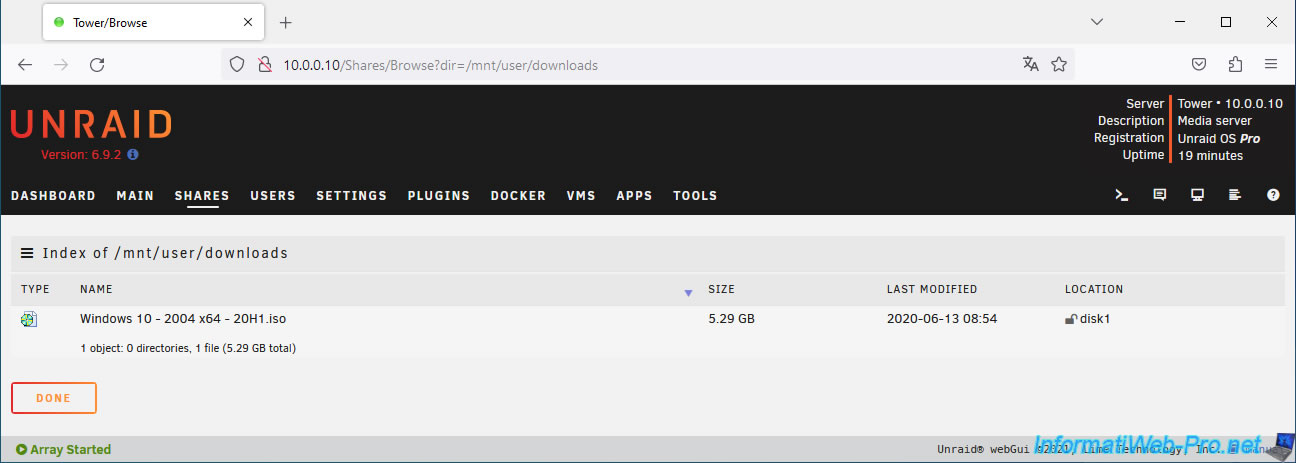 Dans le dossier partagé "downloads", nous avons stocké un ISO de Windows 10 (téléchargé il y a un certain temps depuis le site de Microsoft).