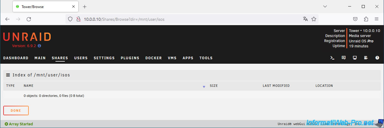 Le dossier partagé "isos" (présent par défaut sous Unraid) est vide pour le moment.