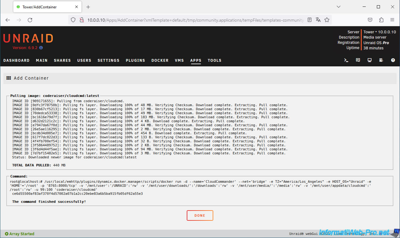 Une fois l'installation et la configuration automatique du container "CloudCommander" terminées, le bouton "Done" apparaitra.