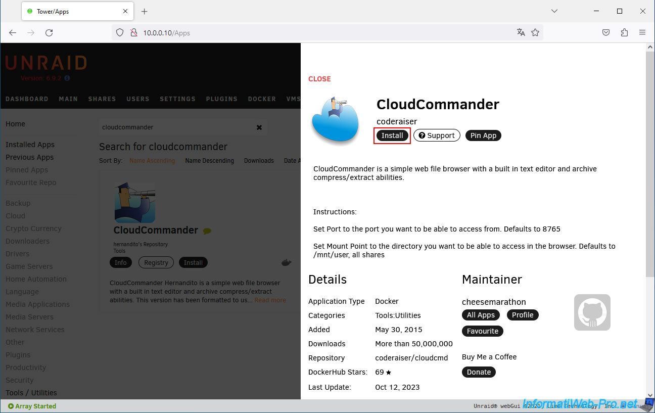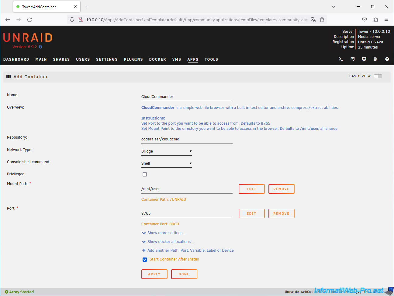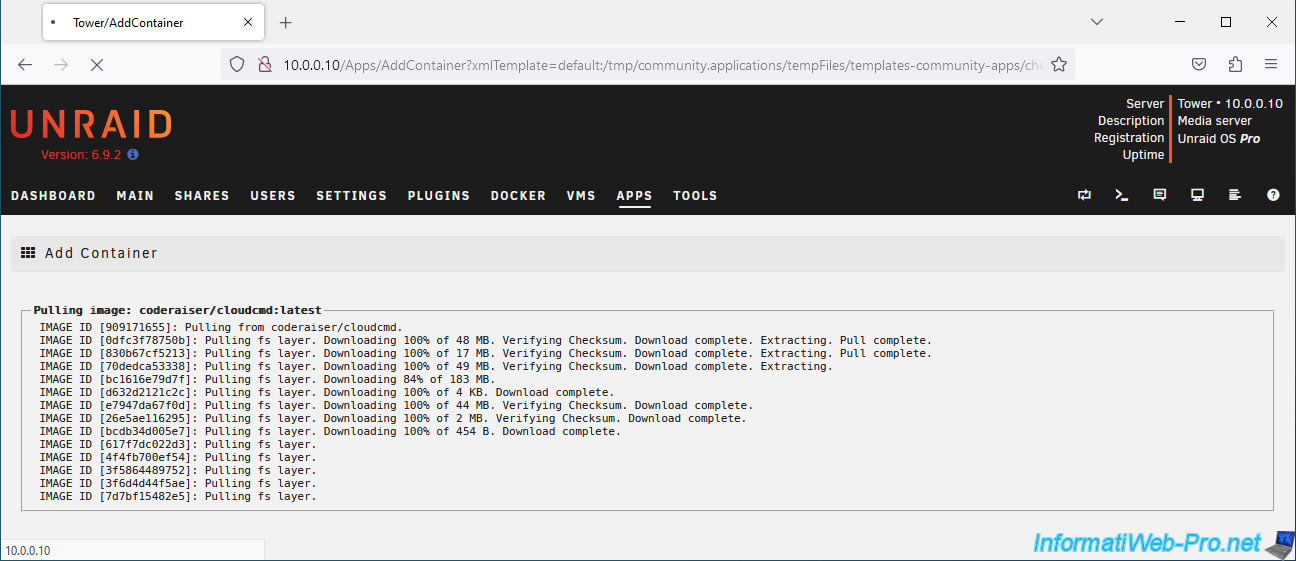 Cliquez sur "Apply" pour lancer l'installation du container "CloudCommander".