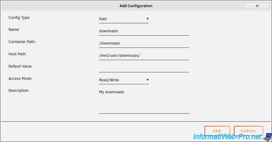 Votre mappage "downloads" apparait avec son nom (à gauche), son chemin (à droite) et sa description (à droite en orange).