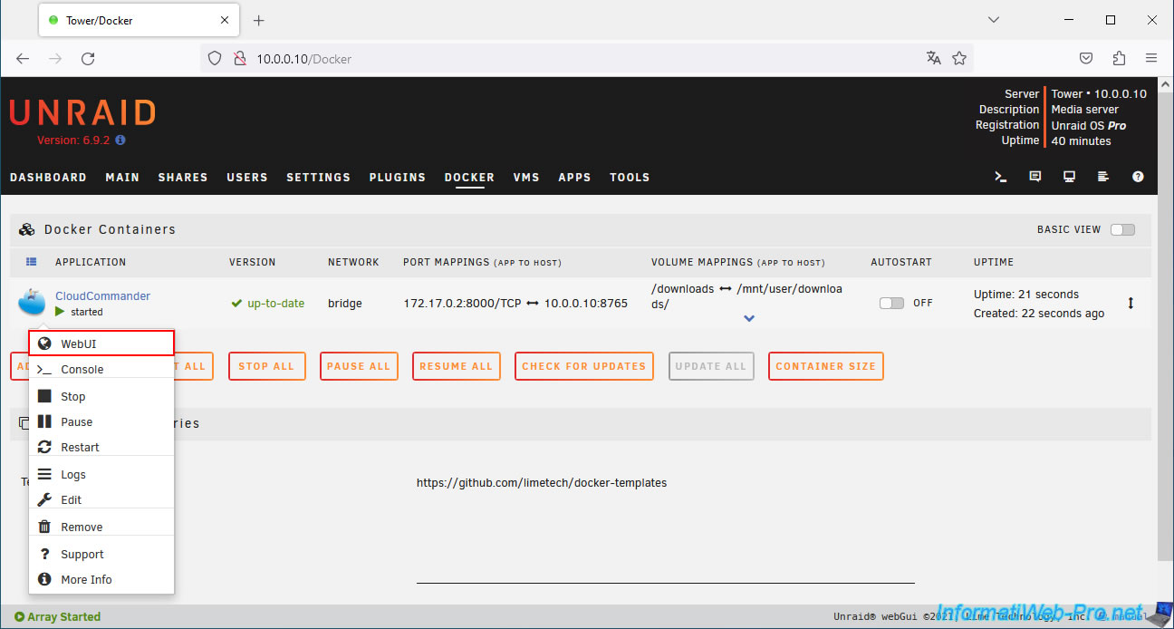 Pour accéder à l'interface web de CloudCommander, cliquez sur l'icône de ce container, puis sur : WebUI.