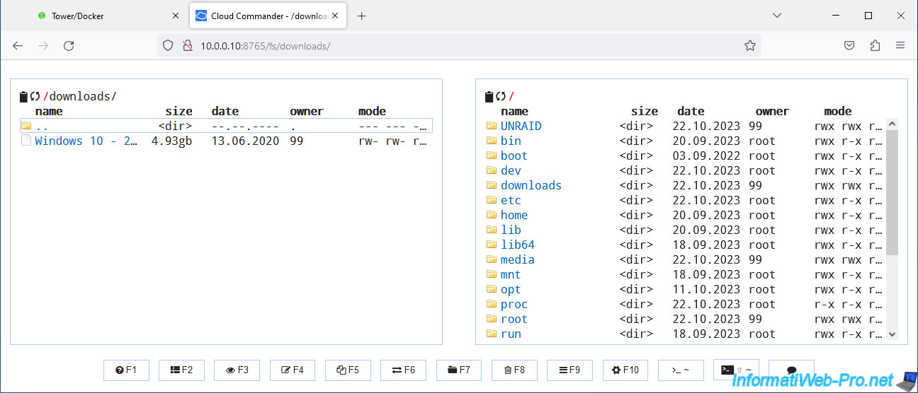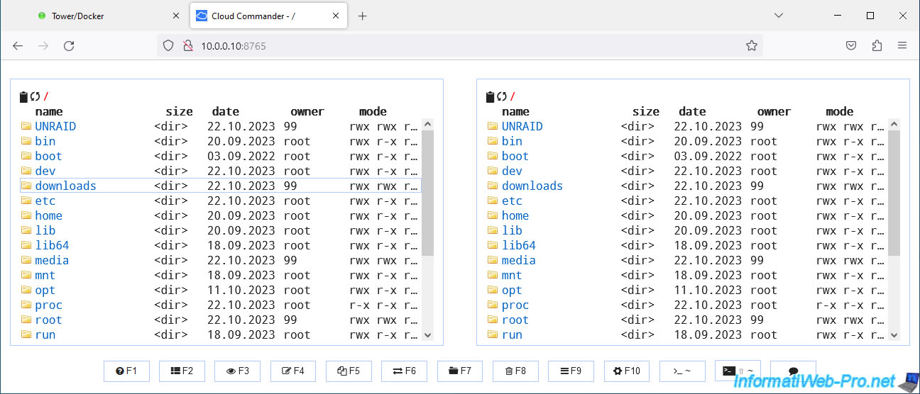 Comme prévu, notre dossier partagé "downloads" apparait également à la racine de Cloud Commander grâce au mappage configuré précédemment.