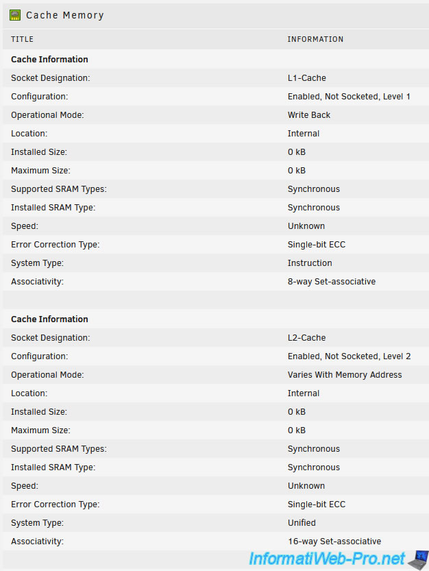 Dans la section "Cache Memory", vous trouverez des informations concernant le cache L1, L2 et L3 de votre processeur (CPU).