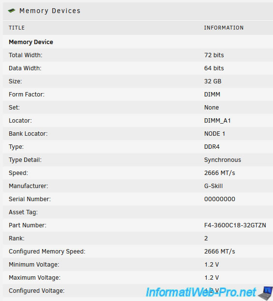 Dans la section "Memory Devices", vous trouverez des informations concernant chaque barrette de RAM (Memory Device) :