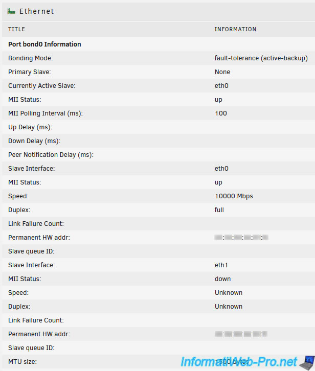 Dans la section "Ethernet", vous trouverez des informations concernant les différentes cartes réseau (interfaces réseau) de votre serveur.