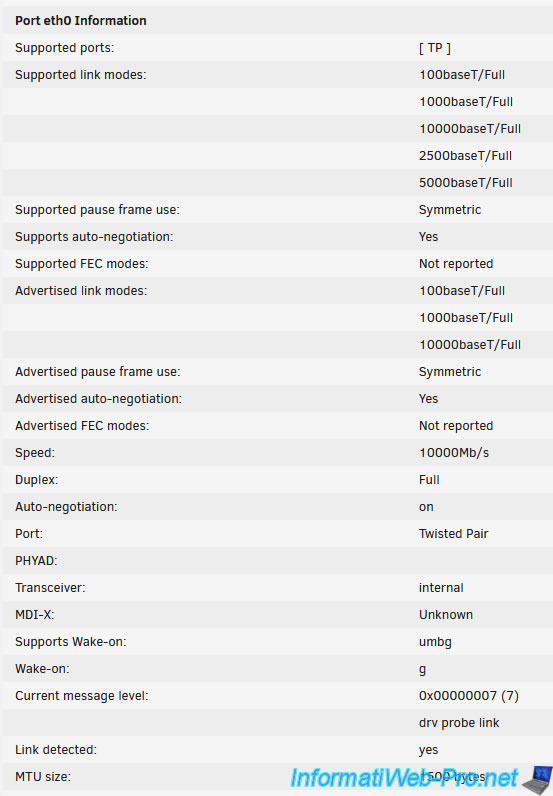 Note : ces informations sont récupérées grâce à la commande "ethtool" disponible sous Linux.