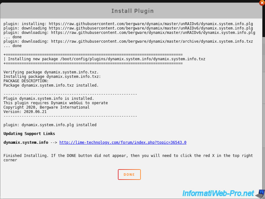 Patientez pendant l'installation du plugin "Dynamix System Info".