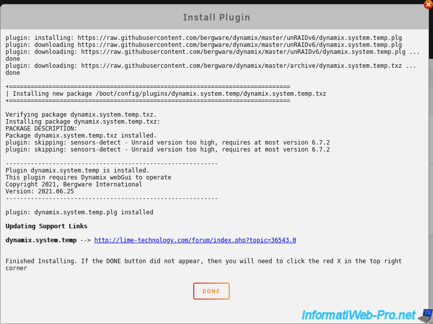 Patientez pendant le téléchargement et l'installation de ce plugin "Dynamix System Temp".