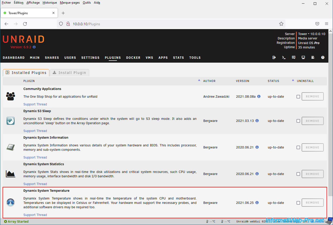 Dans l'onglet "Plugins", vous le verrez apparaitre sous le nom "Dynamix System Temperature".