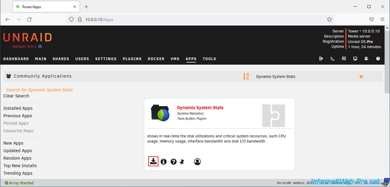 Cliquez sur l'icône de téléchargement du plugin "Dynamix System Stats" qui apparait.