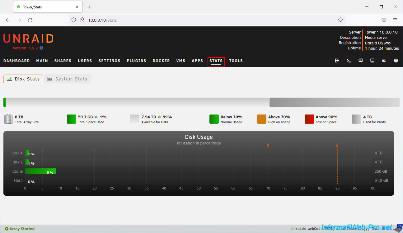Vous pourrez aussi effectuer certaines actions et/ou obtenir différentes informations en allant à différents endroits de l'interface web d'Unraid.