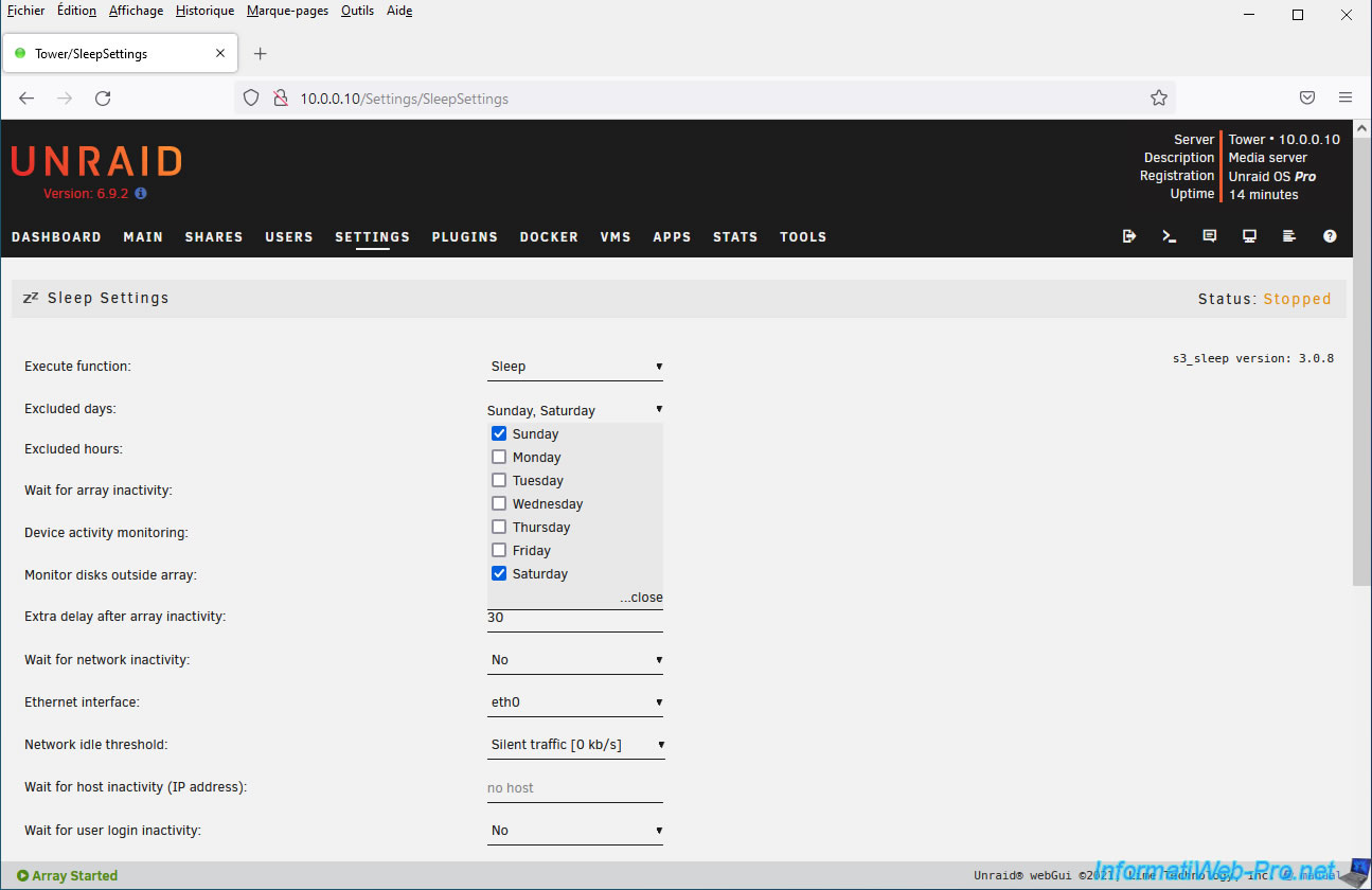 Ensuite, vous pourrez choisir quels jours vous ne souhaitez pas que le serveur se mette en veille en utilisant le paramètre "Excluded days".