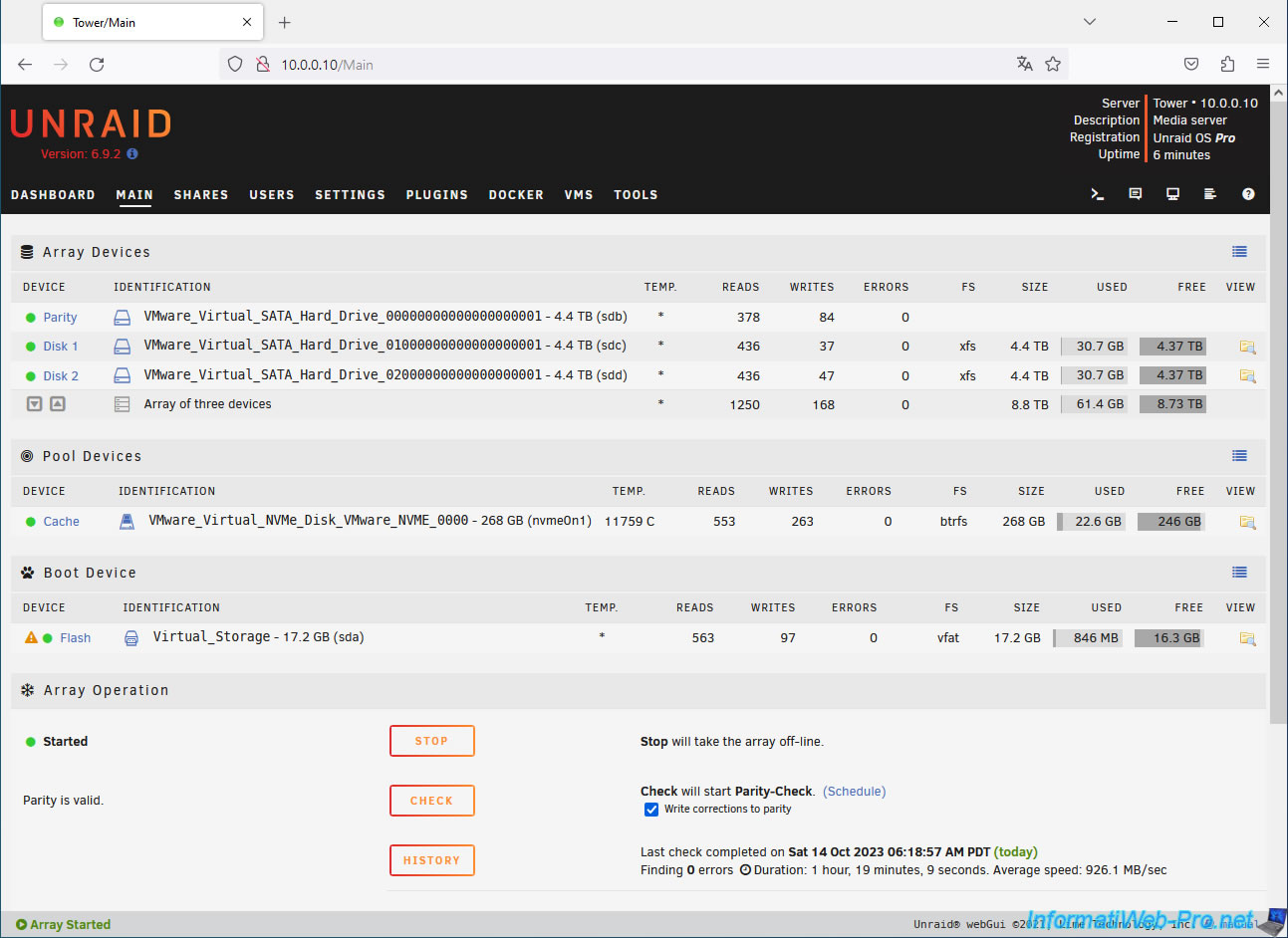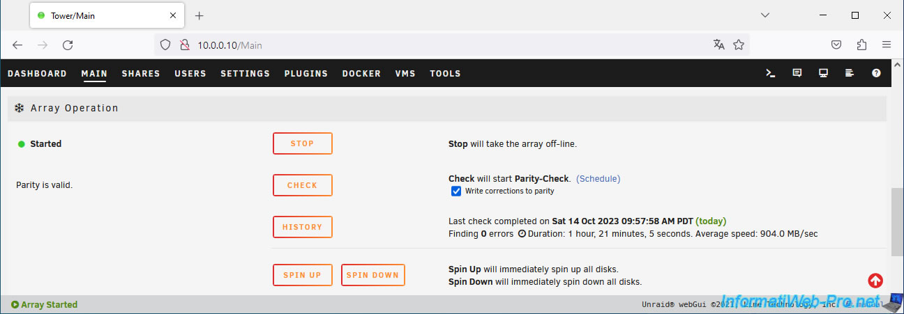 En bas de page, vous verrez que la grappe (array) est démarrée et que la parité est valide (Parity is valid).