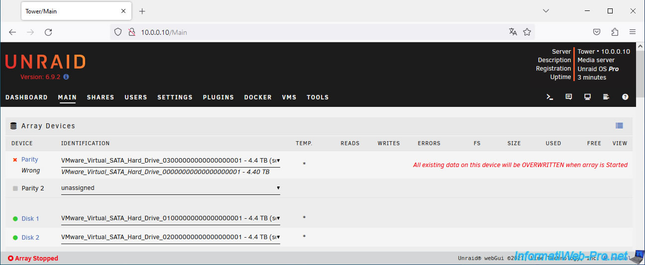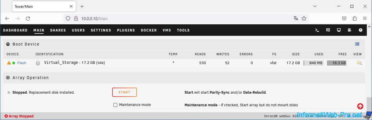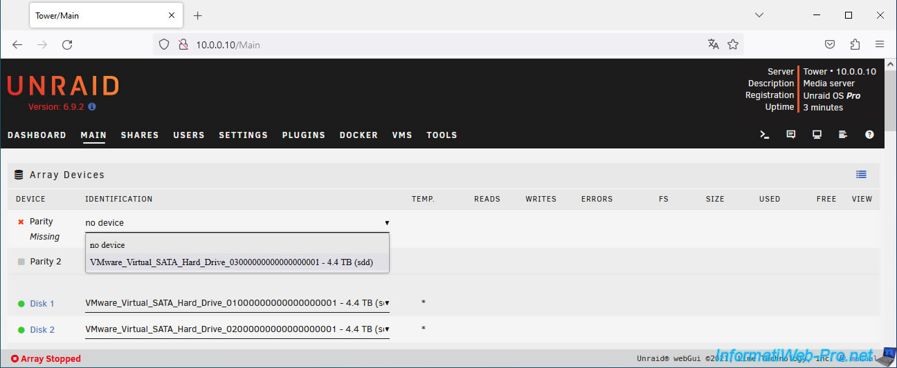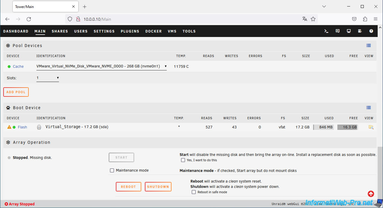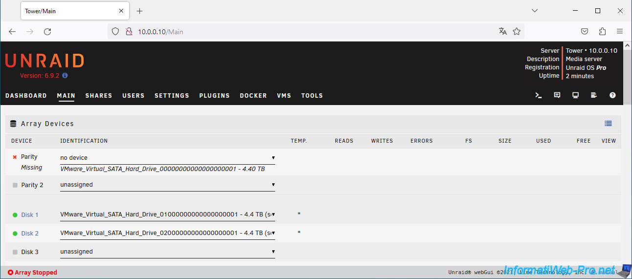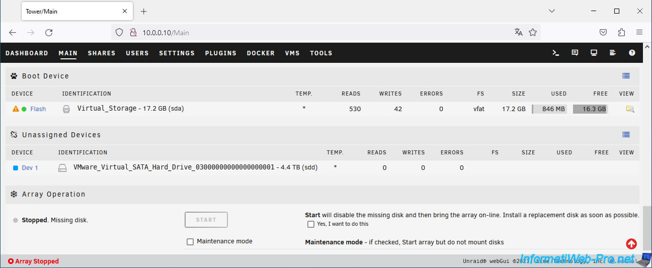 En bas de page, vous verrez que la grappe (array) est arrêtée (Stopped) parce qu'un disque est manquant (Missing disk).