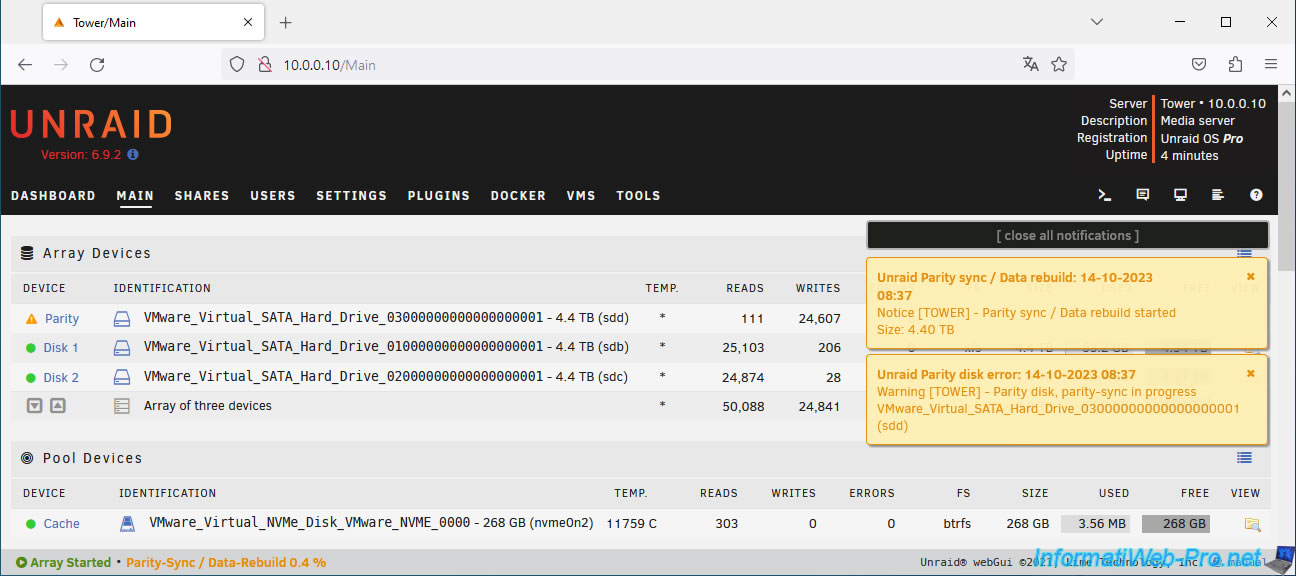 Ensuite, Unraid vous affichera peut-être des avertissements (sous la forme de notifications orange) à propos du disque de parité qui est en cours de calcul.