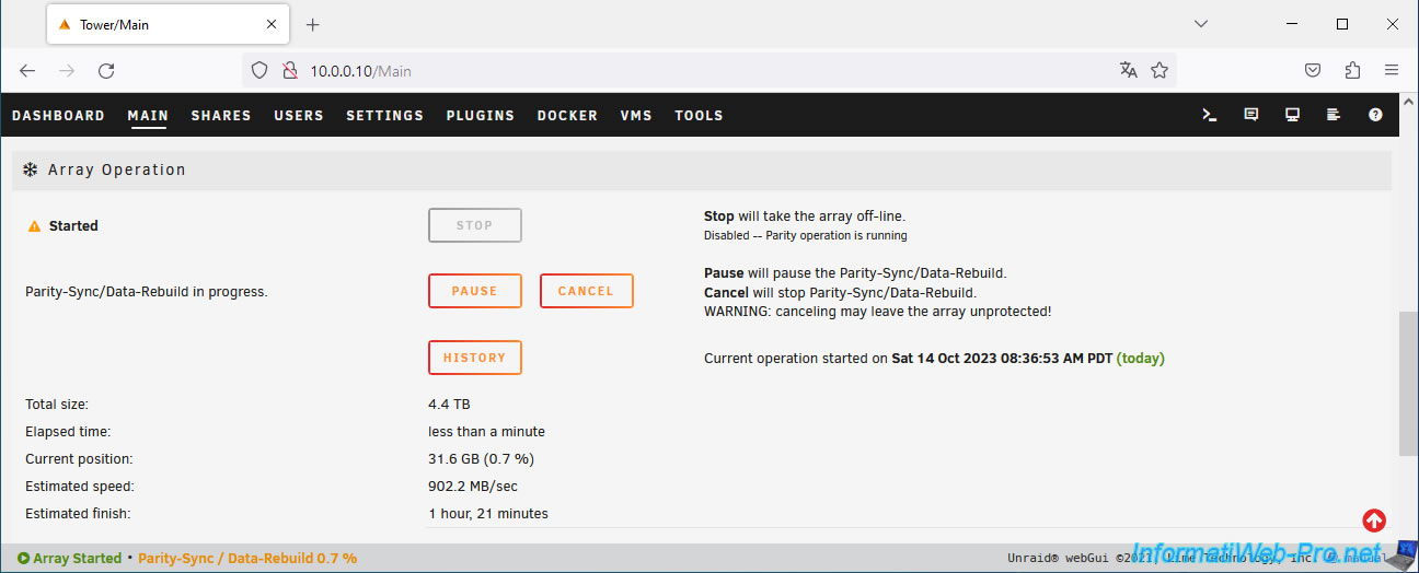 En bas de page, vous pourrez surveiller l'état de la synchronisation de la parité.