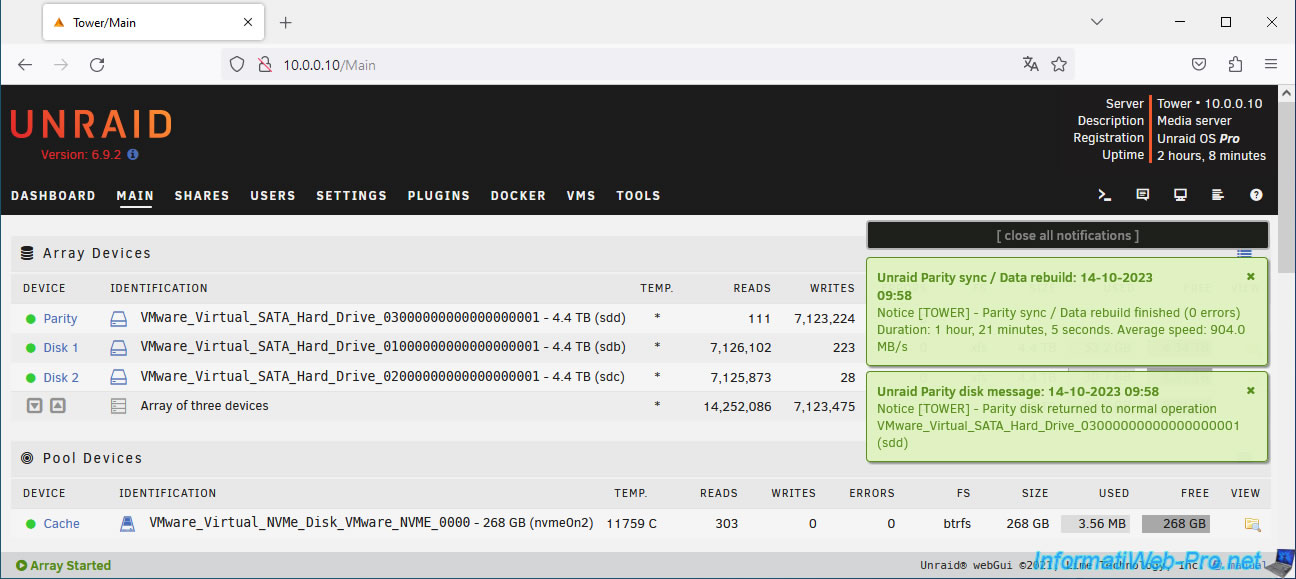 Une fois le calcul du disque de parité terminé, Unraid vous affichera des notifications vertes pour vous indiquer que la synchronisation de la parité est terminée et que l'état du disque de parité est de nouveau normal.