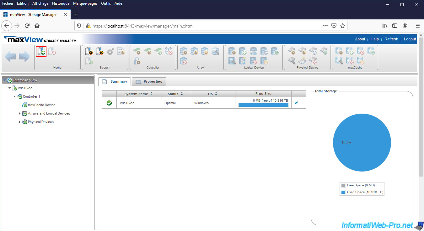 Plus tard, si vous souhaitez enlever un système distant de votre interface web "maxView Storage Manager", sélectionnez-le à gauche et cliquez sur la 2ème icône (Delete System) dans le bloc "Home" situé en haut de page.