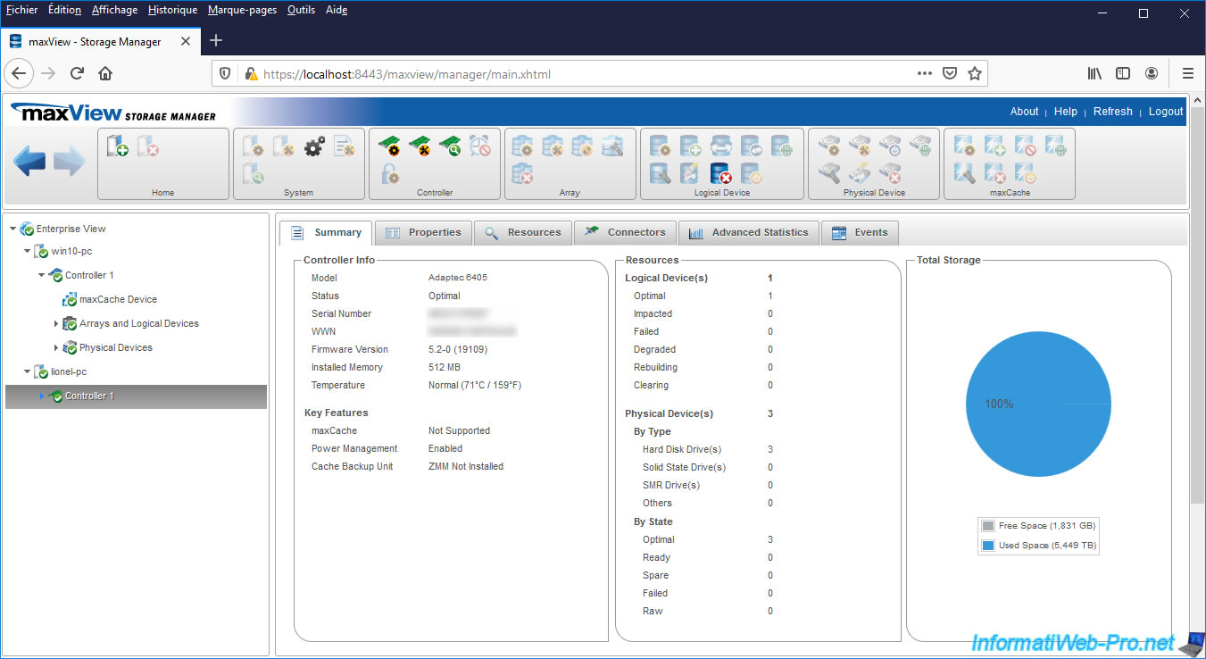 Si nous sélectionnons son contrôleur, nous pouvons voir qu'il s'agit d'un ancien contrôleur "Adaptec 6405" avec un disque logique, 3 disques physiques, ...