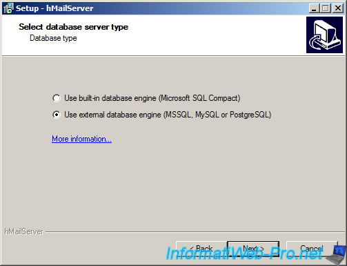 Pour la base de données contenant les E-Mails, 2 choix s'offrent à vous. Soit un serveur de base de données SQL intégré avec hMailServer ou un serveur externe MSSQL, MySQL ou PostgreSQL.