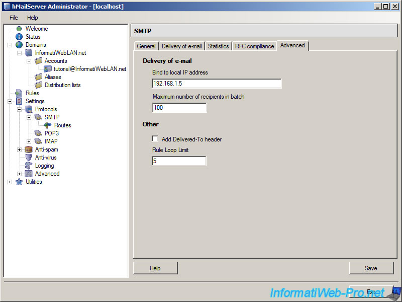 Si le serveur SMTP requiert une "Authentification", indiquer les identifiants nécessaires dans l'onglet "Delivery" puis cliquez sur "Save".