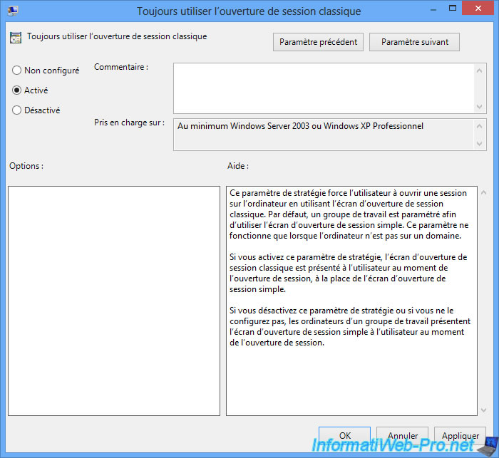 Allez dans "Configuration ordinateur -> Modèles d'administration -> Système -> Ouverture de session" et faites un double-clic sur la stratégie "Toujours utiliser l'ouverture de session classique".