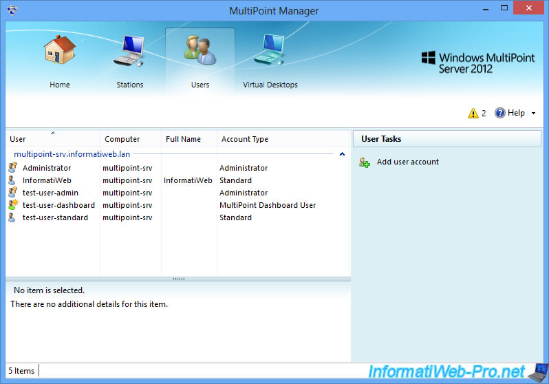 Néanmoins, le rôle Active Directory (AD DS) ne peut pas être installé sur un serveur Windows MultiPoint Server 2012. Comme Rob Elmer (employé chez Microsoft) l'a confirmé sur le forum de Microsoft.