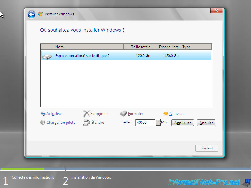 Il faut savoir qu'un serveur Windows est quelque chose de très sophistiqué et qu'il y a beaucoup de configurations à faire on conseille donc de mettre au moins 2 partitions. La première pour l'OS (Système d'exploitation : Windows Server 2008 dans ce cas) et la 2ème pour les sauvegardes de disques.