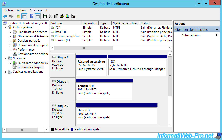 Sur un des serveurs de votre futur cluster, ouvrez la console "Gestion de l'ordinateur" et allez dans la gestion des disques.