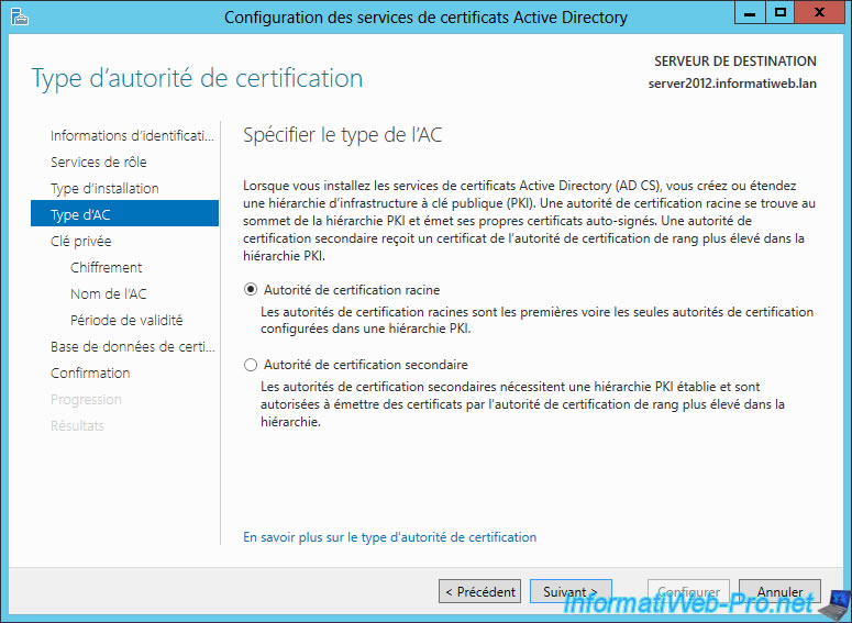 Sélectionnez "Autorité de certification racine" car notre autorité ne sera pas dépendante d'une autre.