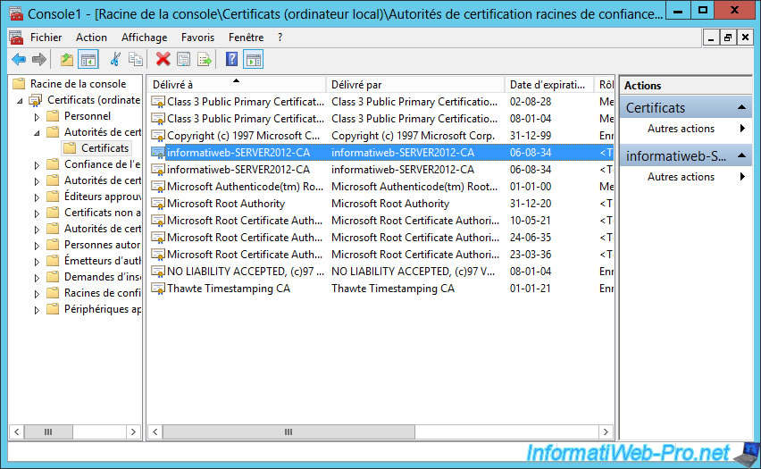En allant dans "Certificats ... -> Autorités de certification racines de confiance -> Certificats", vous verrez que notre certificat racine est déjà présent dans cette liste.