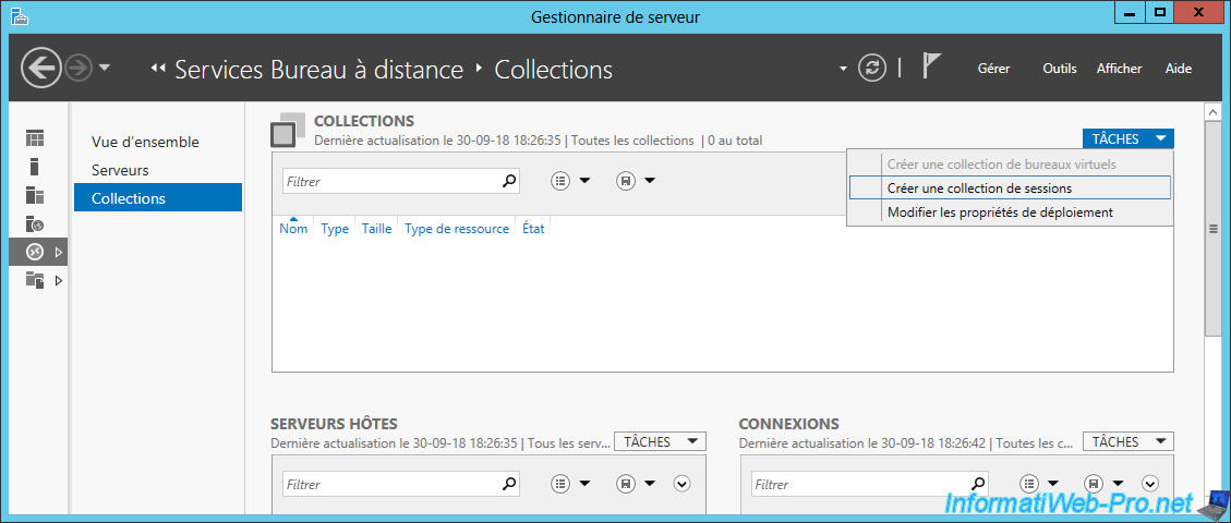 Pour créer votre première collection, vous pouvez allez dans "Services Bureau à distance -> Vue d'ensemble", puis cliquez sur le lien "3. Créer des collections de sessions" situé en dessous de "Déploiement de bureaux basés sur une session".