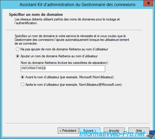 Grâce à ce paramètre, nos utilisateurs pourront se connecter sans devoir ajouter le préfixe "INFORMATIWEB\" devant leur nom d'utilisateur.